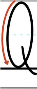Like the capital O, begin at the top and gently curve down and around counterclockwise, grazing the baseline and returning again to the top to make an even oval. To make the tail of the Q, start a second stroke halfway between the baseline and X-line, slightly off-center of the oval. Graceful carve down and to the right, ending just below the baseline.